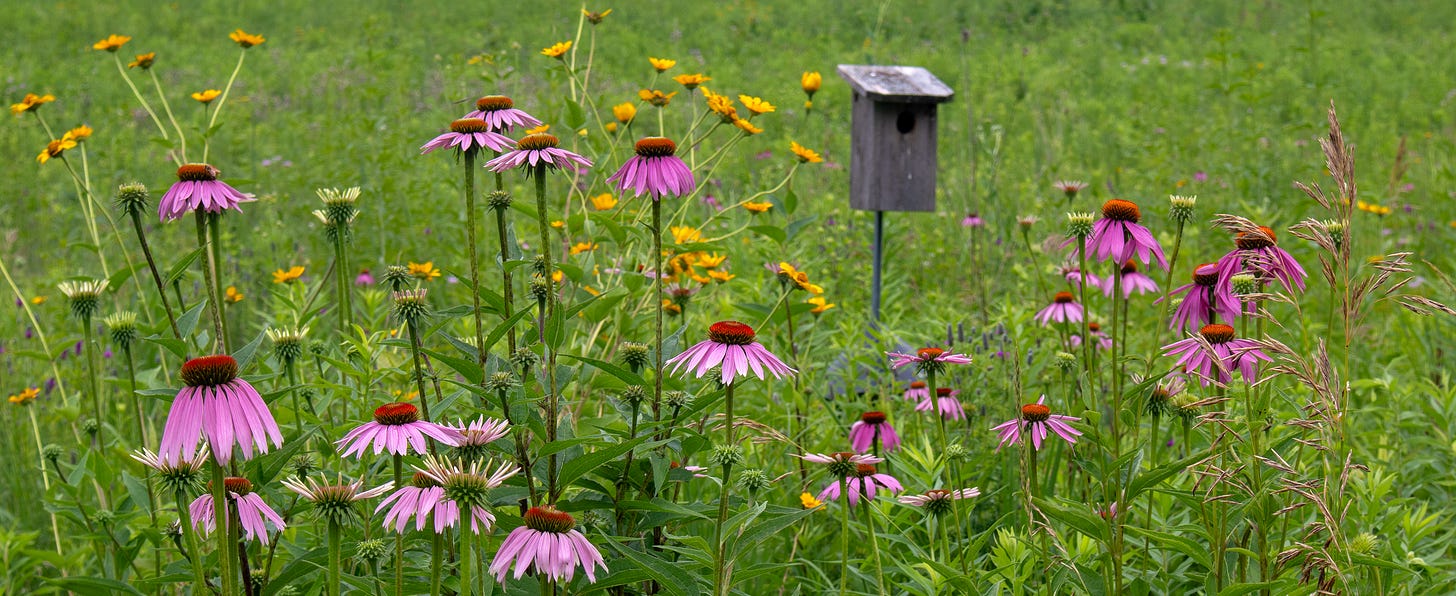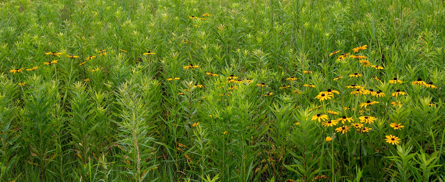 The midwestern summer air is heavy, humid, gelatinous. There’s a sense that everything on the prairie stings, bites, cuts, begets rash. Hikers flinch and swat at real and imagined attackers alike: mosquitos, spiders, biting flies, nettles, poison ivy. But there is beauty too, and you can see it in the tall, proud Purple Coneflowers and the joyful Annual Sunflowers. The prairie plant list is extensive and animated with peculiar names: Rattlesnake Master, Joe Pie Weed, Junegrass, Milkweed, White Snakeroot.