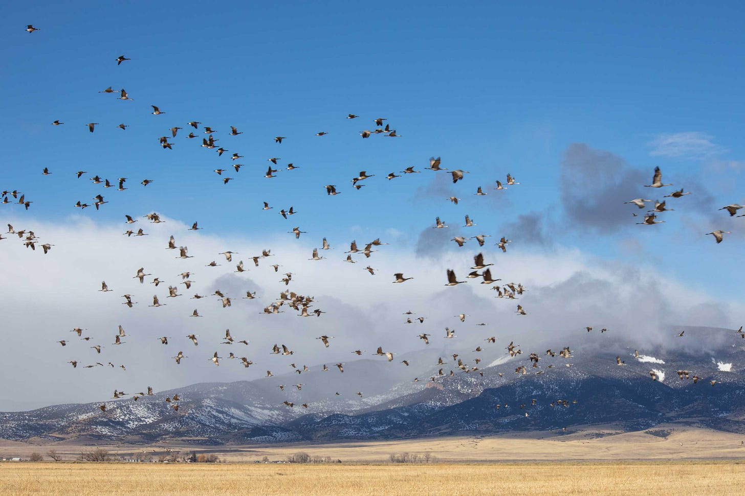 Today, more than 800,000 sandhill cranes travel along multiple flyways across North America. Each spring and fall, the cranes gather to recharge at stopover points along their journey—places such as the marshy Sandhills of Nebraska and the wet meadows of Colorado’s San Luis Valley.